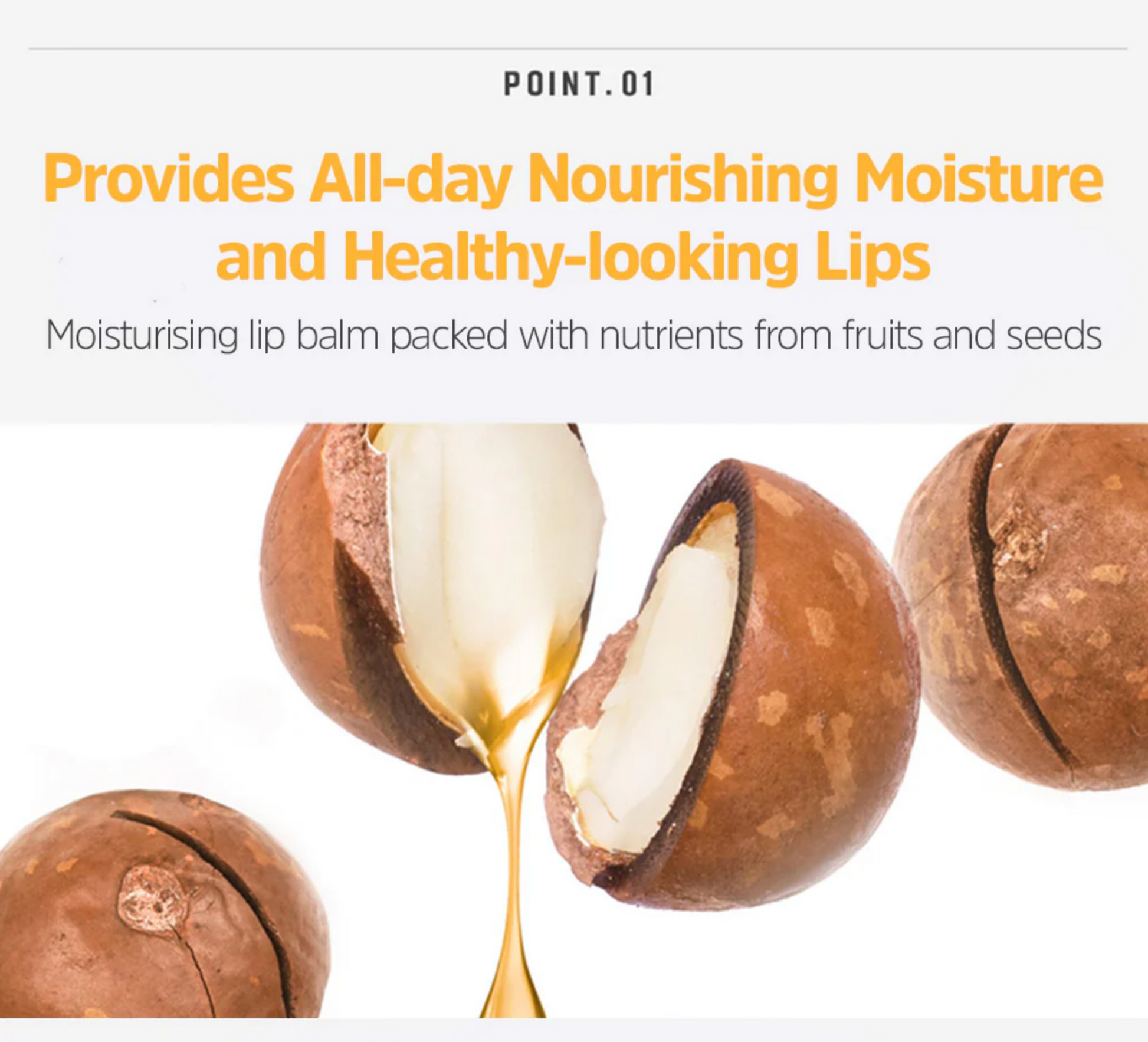 - It forms a long-lasting moisturizing coating film with skin-friendly Ricinus Communis (Castor) Seed Oil and Macadamia Ternifolia Seed Oil, gently and moisturizingly protecting dry and delicate lips.