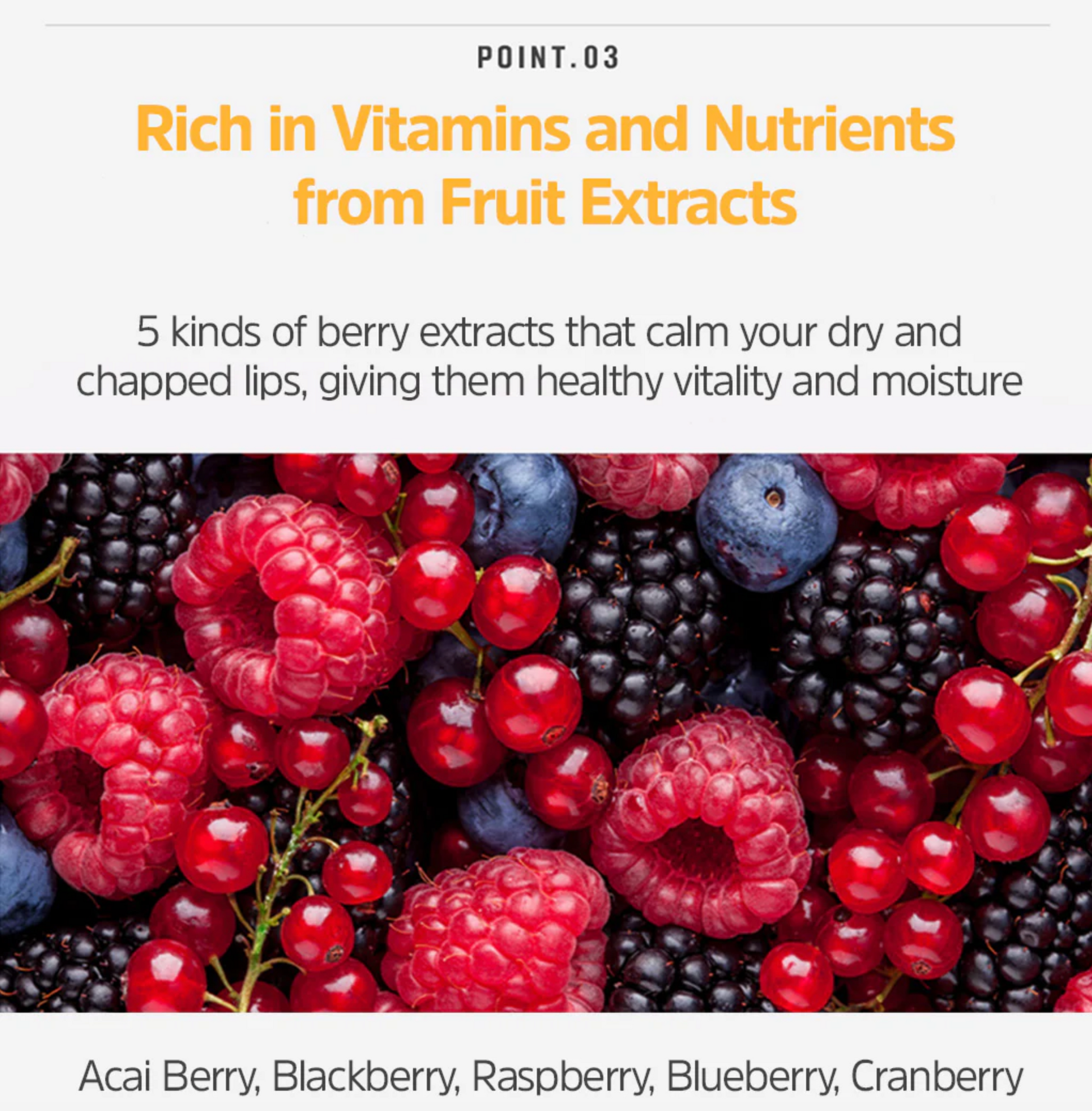 It contains five types of berry extracts to soothe dry and chapped lips and deliver healthy vitality and full moisture.