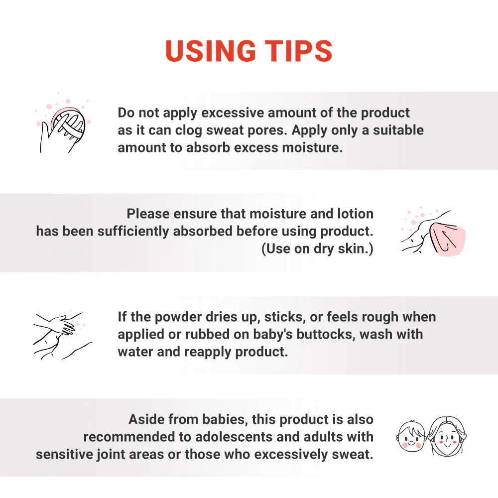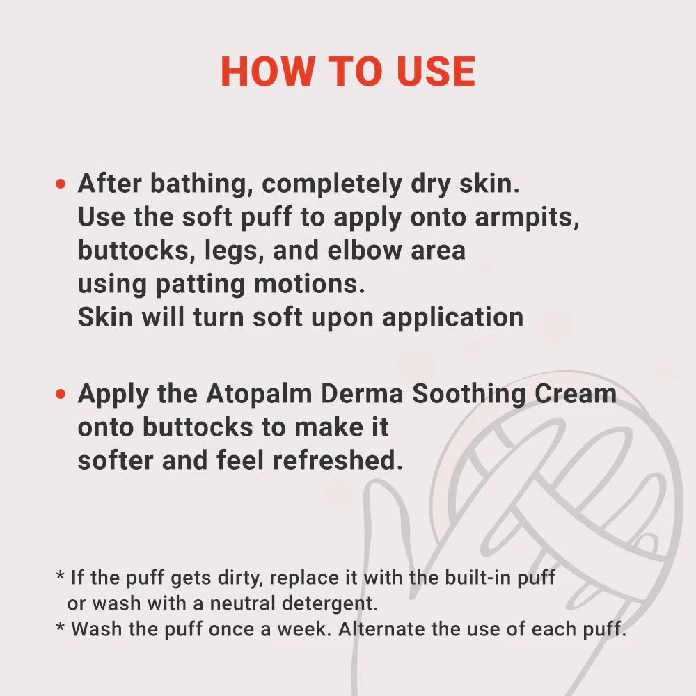 - ATOPALM Derma Soothing Powder is developed with MLE moisturizing powder and starch derived from rice and corns, instead of using Talc for weak and sensitive baby skin.