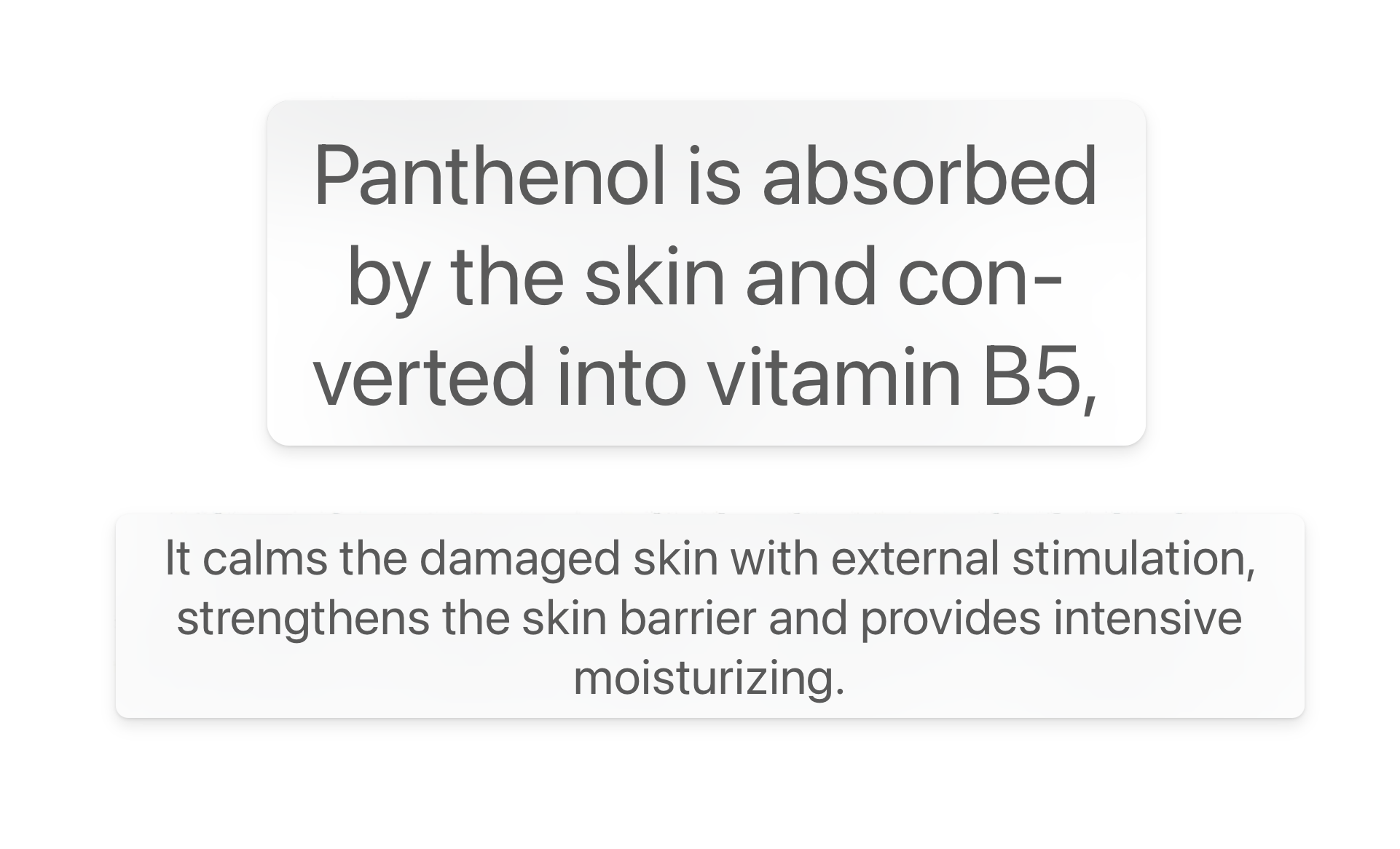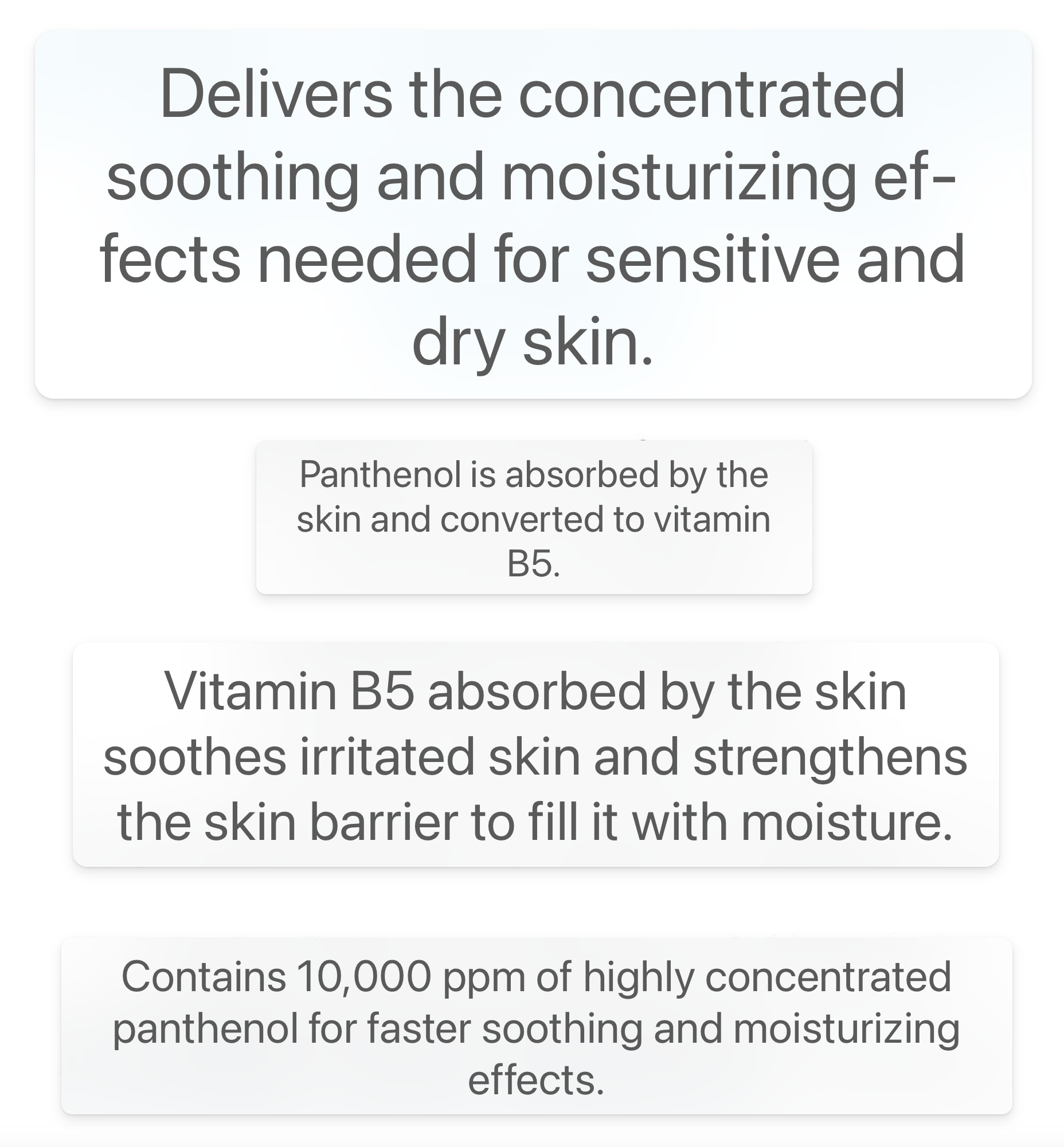 - MOISTURIZER REPARING SKIN: Soothing irritated & sensitive skin with 10% of Panthenol. Absorbed panthenol changes to Vitamin B5 so that soothes the eczema skin, and strengthens the skin barrier; 72 hrs hydration