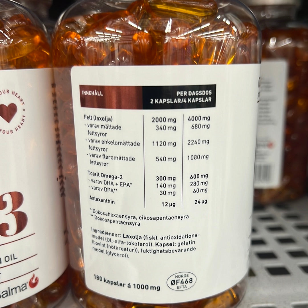 Only pure and natural salmon oil! In our dietary supplement Omega-3 Salmon Oil, the salmon oil is completely natural and unchanged. Through a gentle process, the oil is extracted from fresh Norwegian salmon and contains the unique nutrients found in the salmon. Among other things, natural phospholipids and the antioxidant astaxanthin, which also gives the oil its beautiful red-orange color. Here, of course, you will find the Omega-3 fatty acids EPA and DHA. Together, they strengthen the normal function of your heart. Lots of good stuff in a single capsule.