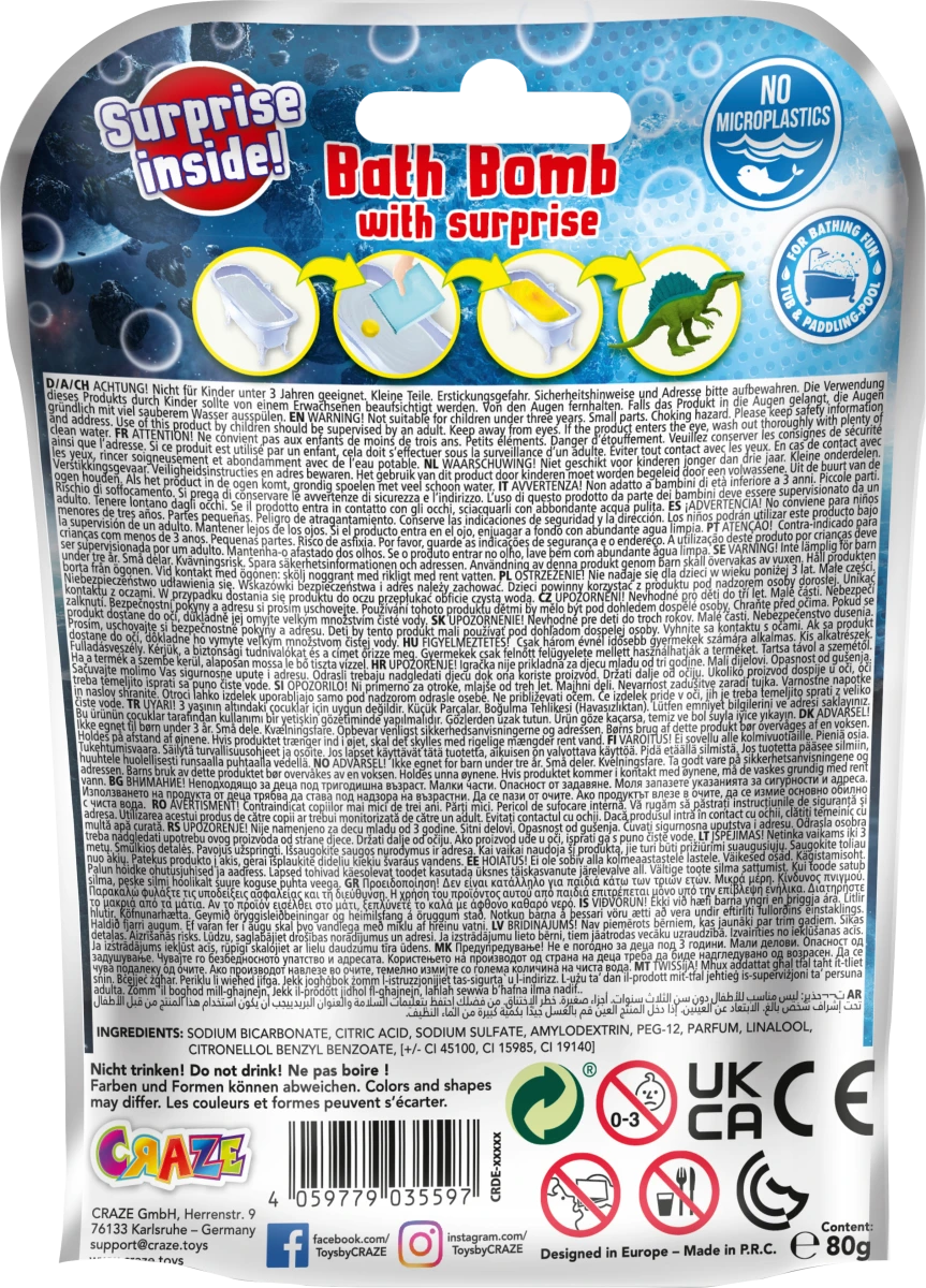 The CRAZE inkee Surprise Bath Bomb Dino is a prehistoric, fun adventure for the bathtub. The bubbling bath bomb for children colors the water and exudes a fruity, fresh raspberry scent. But that's not all: Inside the child-friendly bath bomb there is one of a total of 5 dinosaur figures to play with, collect and swap. The bath bomb is also tested by TÜV Rheinland, rated “very good” by the independent Dermatest Institute and is free of microplastics and water-soluble, purely synthetic polymers.