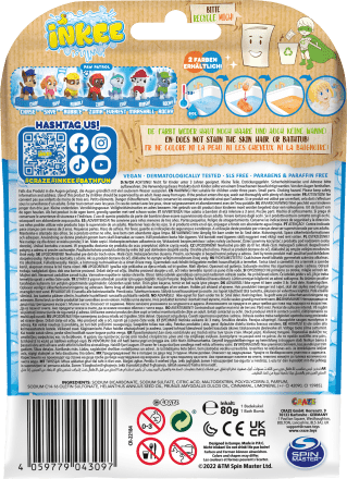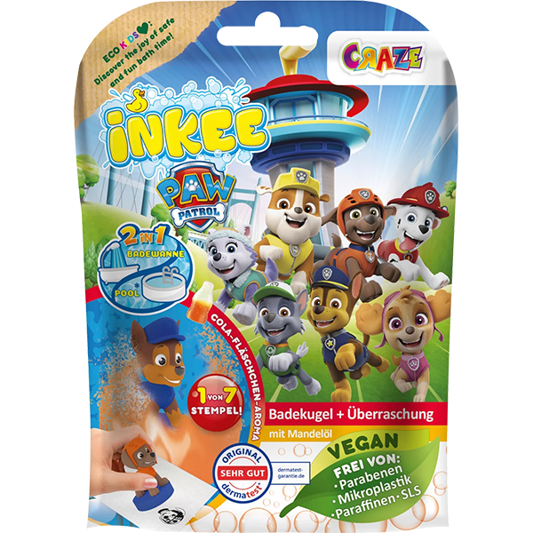 The Inkee Craze Surprise Bath Bomb Paw Patrol offers multiple fun for the many Paw Patrol fans. As the bath bomb dissolves bubblingly in the water and exudes a sweet cola-gummy bear scent in the room, the excitement increases as to which of the 7 different stamps is contained in the bath bomb.