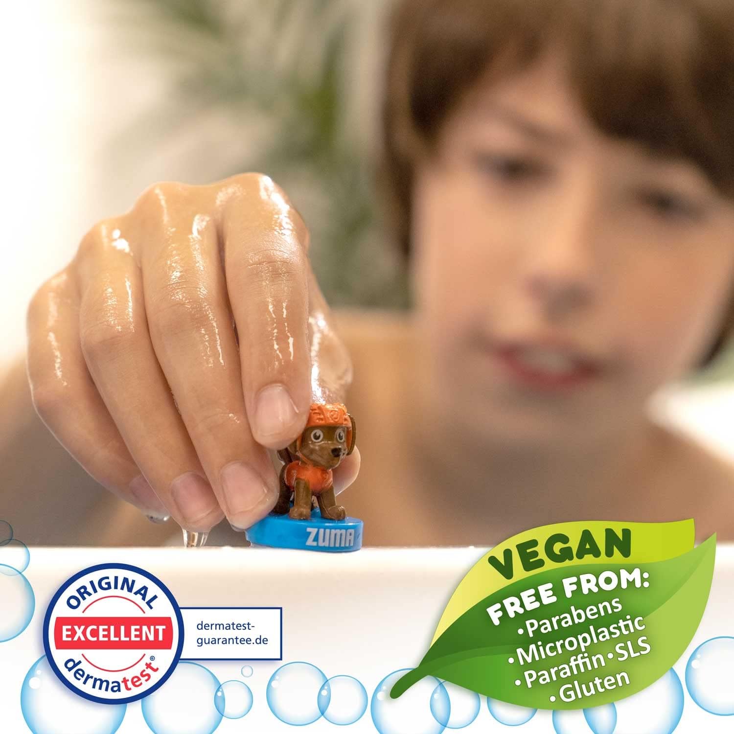 The bath bomb is also tested by TÜV Rheinland, rated “very good” by the independent Dermatest Institute and is free of microplastics and water-soluble, purely synthetic polymers.