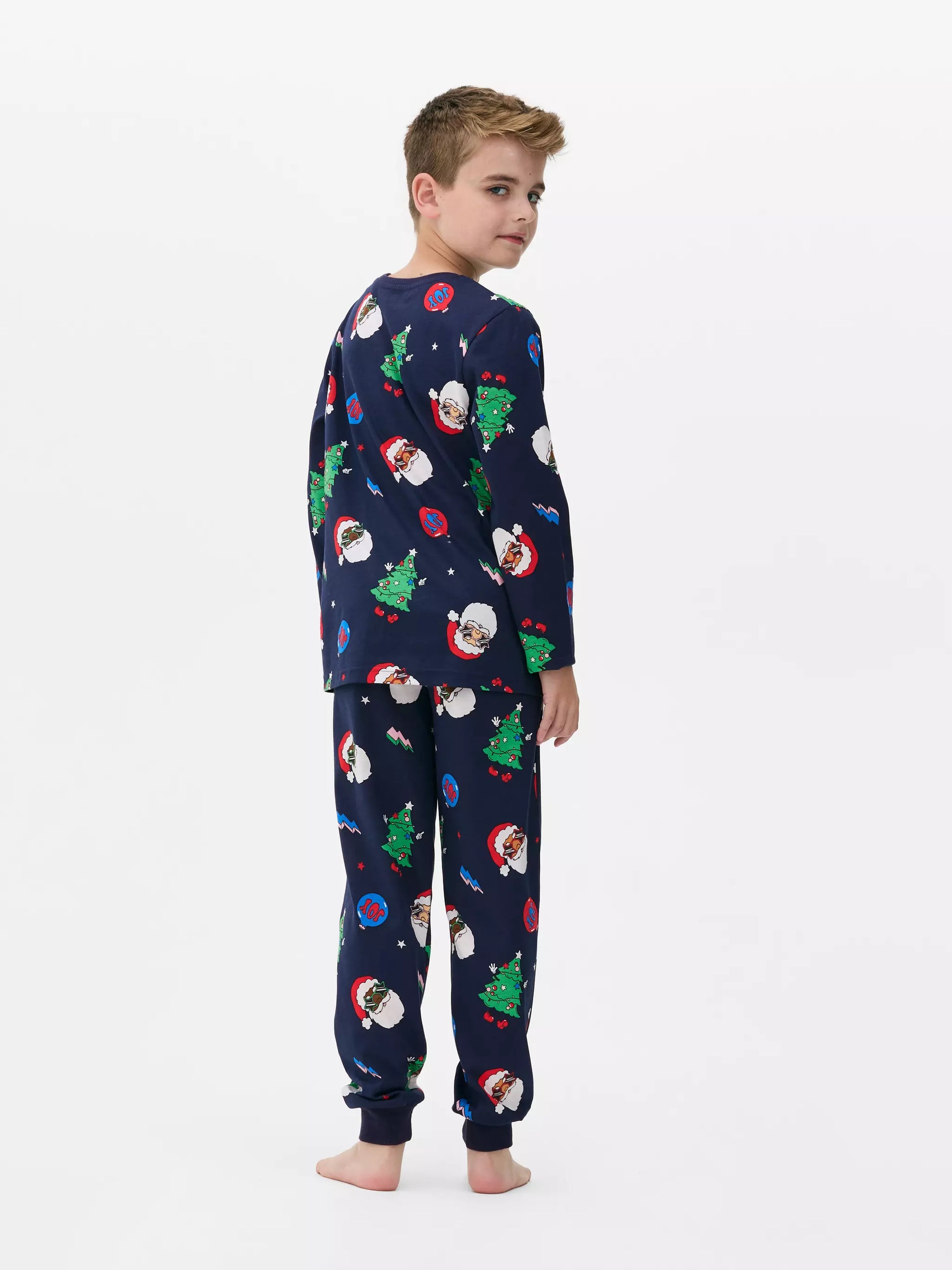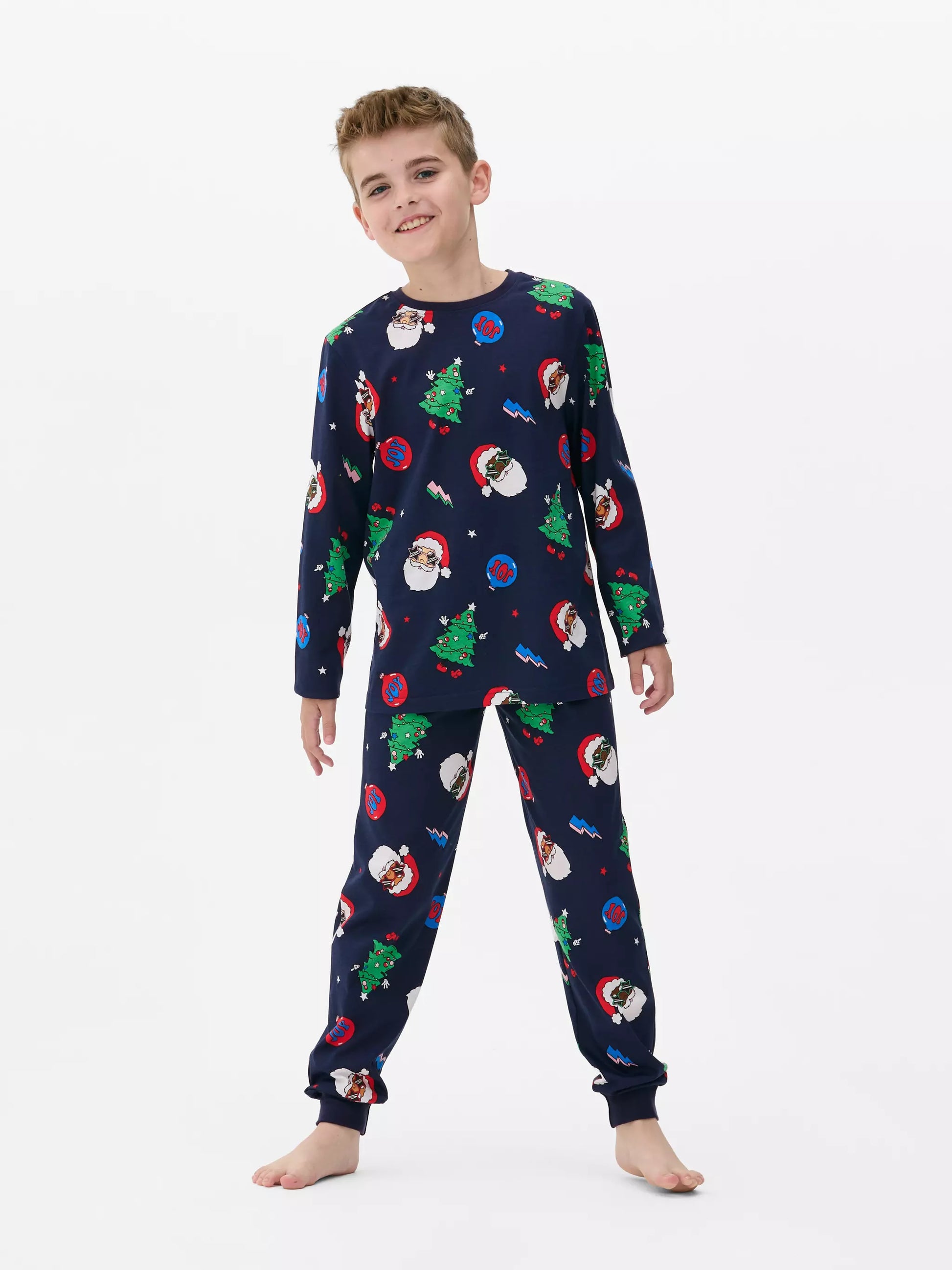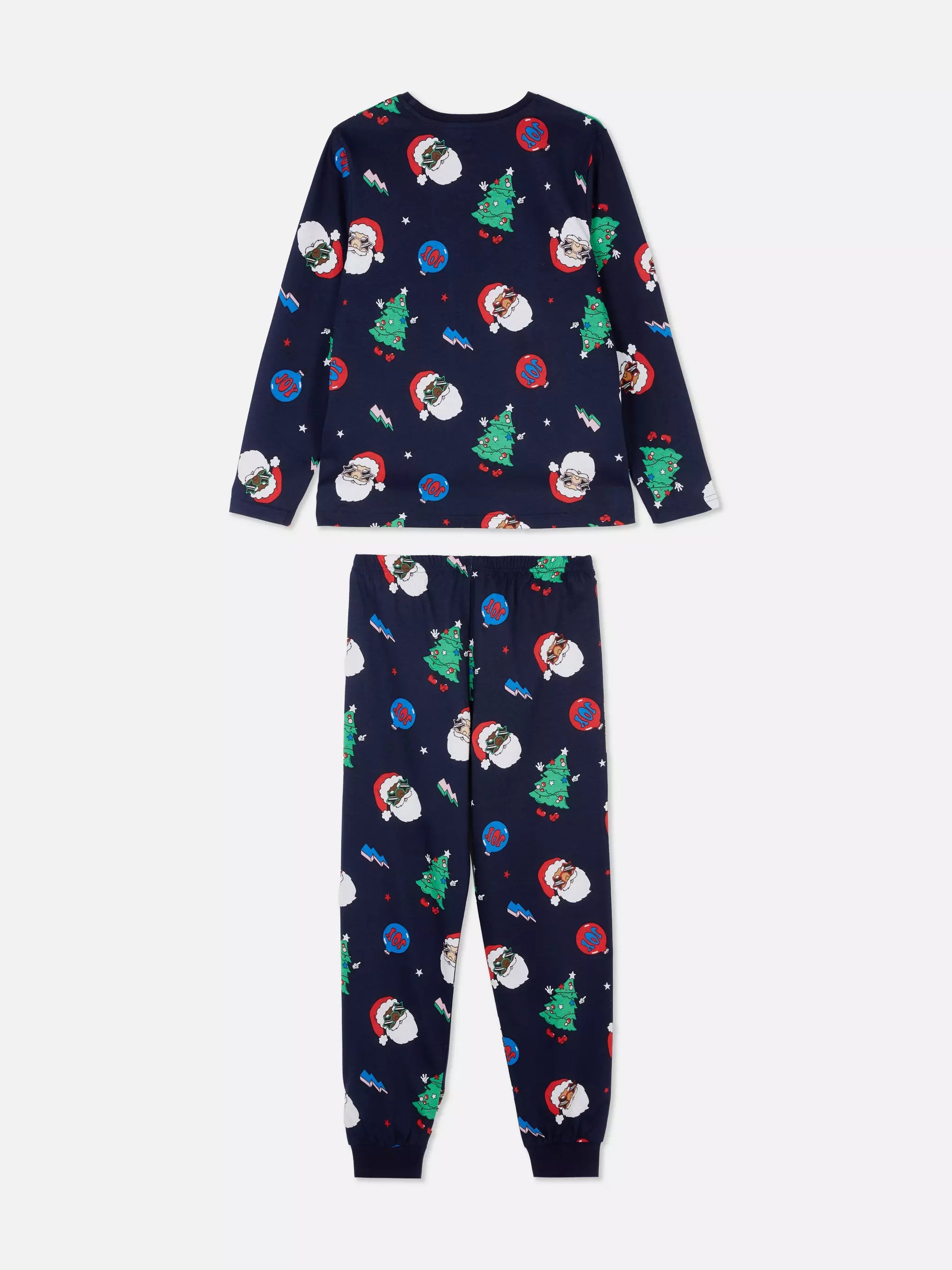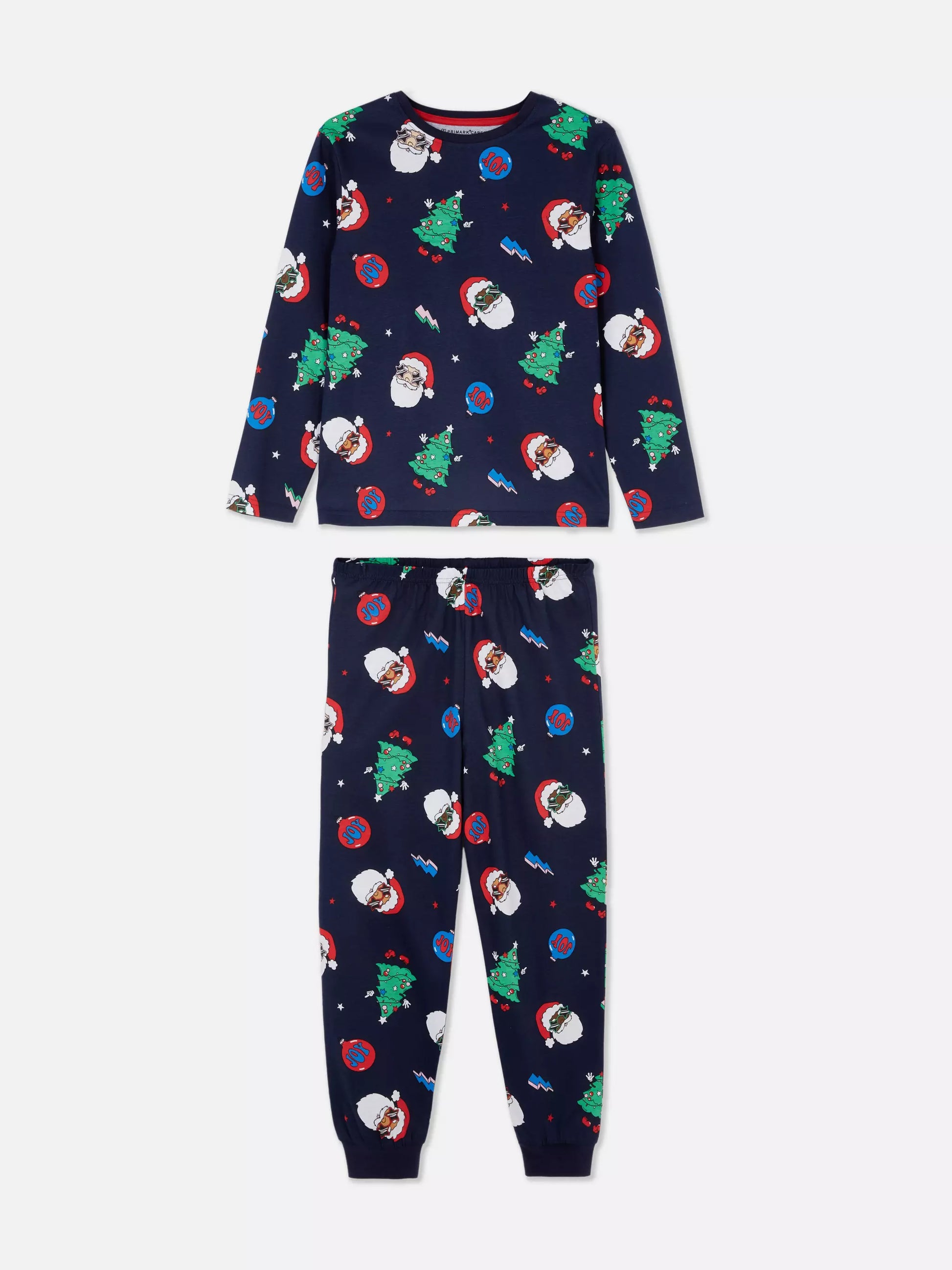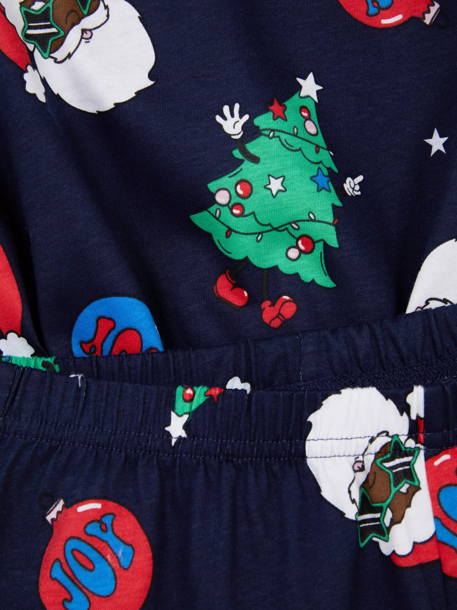 A Christmas jersey pajama set with a long-sleeved top and long pants with a festive pattern!